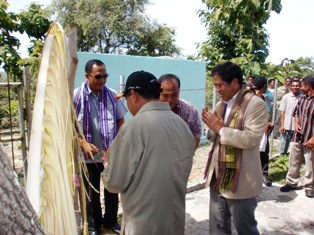 (左より、カエイロ国務長官、テメオエクシ担当国務長官、駐オエクシ・インドネシア総領事、北原大使)村人にお祝いのスピーチを行う北原大使